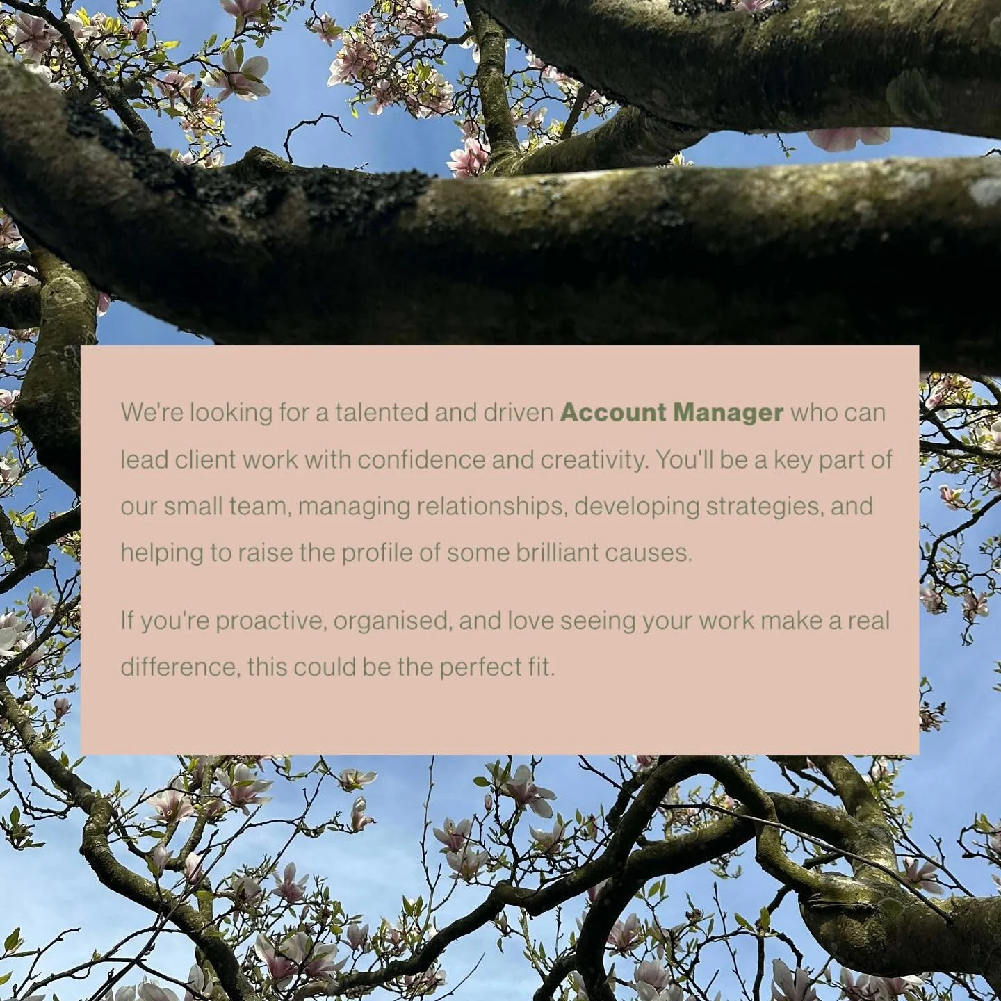 We're looking for a talented and driven Account Manager who can lead client work with confidence and creativity. You'll be a key part of our small team, managing relationships, developing strategies, and helping to raise the profile of some brilliant causes.
